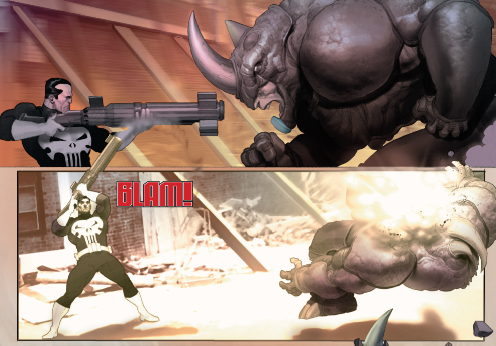 Then the comic returns to the new Microchip, who is under attack by a rogue S.H.I.E.L.D. agent named Bridge. Microchip escapes and reunites with Punisher in Punisher’s hideout. Bridge has the Rhino in his employ, and sends Rhino after Punisher. Punisher uses a gigantic gun named the “Satan Claw” to defeat Rhino. Punisher tells Rhino to send a message to the rest of New York: “I’m back!”
