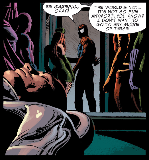 First, let’s go back to Amazing Spider-Man, where a lot happens. Starting in the middle of issue #536, after Spidey’s fight with Iron Man and his subsequent joining Captain America’s side. Now recovered from the fighting, Peter returns to the high school where he’s been teaching, and we learn this is where Mary Jane and Aunt May are hiding out from Iron Man and S.H.I.E.L.D.’s cape-killers. Mary Jane figures out that Peter intends to fight alongside Cap rather than lay low. Aunt May had also already figured this out, as she has saved one of Peter’s original Spidey suits to replace the high-tech Iron Spider armor. Peter then checks the three of them into a cheap motel.