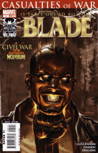 You might have noticed that Wolverine was absent from the big confrontation at the end of Civil War #6. After he escaped from S.H.I.E.L.D. custody in Wolverine #47, he ends up in Blade #5, another Casualties of War issue. S.H.I.E.L.D. hires Blade to track down and apprehend Wolverine.