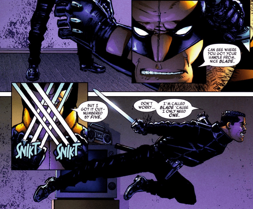 They’re evenly matched when they fight, but then Blade remembers meeting Wolverine years earlier, when Wolverine helped him. He lets Wolverine go, and he tells S.H.I.E.L.D. that Wolvie is not their problem, as long as he doesn’t kill someone he’s not supposed to.