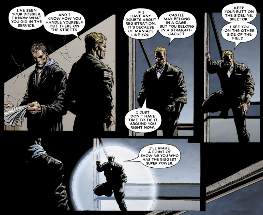 Spector dons the Moon Knight cowl anyway, and continues his hunt for the Midnight Man, roughing up more criminals along the way. The trail leads to the Punisher. The series leaves Civil War behind at this point, as the confrontation is more about Moon Knight and Punisher’s shared history rather than anything related to the crossover.