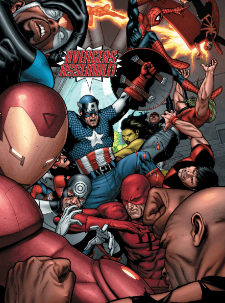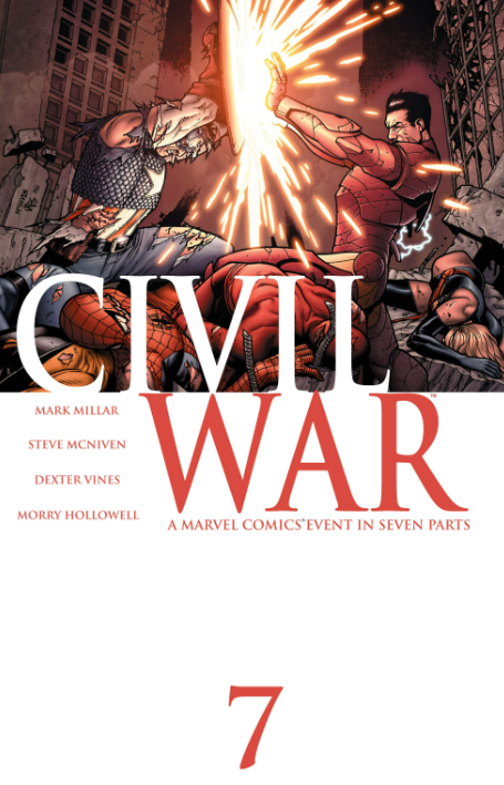 The issue of superhero registration has divided the entire Marvel Universe. After a lot of fighting and casualties, Captain America’s anti-reg side and Iron Man’s pro-reg side confront each other at Ryker’s Island. Let’s do this!