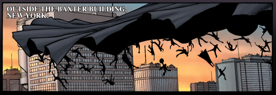 Dagger contacts Cloak and tells him he must pull off the biggest teleport he’s ever done. Cloak absorbs everyone into his cloak and teleports them all to the sky over Manhattan. Those who can fly save some of their teammates, but others are shown crashing to the ground in a huge explosion (let’s assume these are the super strong and/or invulnerable characters). There’s a quick glimpse of Iron Man ordering the NYPD to evacuate civilians from the area.