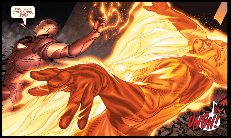 Flame on: I don’t know what Johnny was thinking by flying straight at Iron Man instead of attacking from a distance. But at least he got to have a scene during the finale, rather than be drawn fighting someone in the background like most of the heroes.