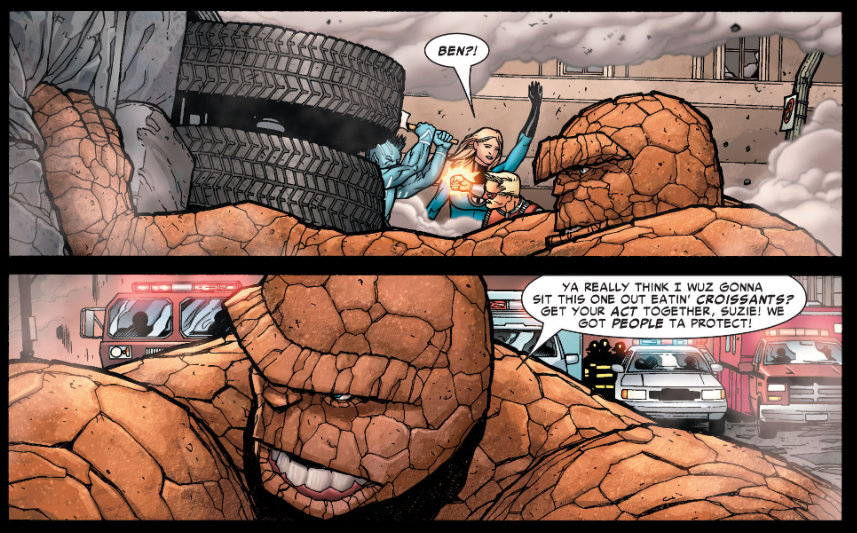 Now go back to Civil War #7. Cap and Iron Man go face-to-face once again. The Vision weakens Iron Man’s armor, allowing Cap to pummel him. The Thor clone tries to help Iron Man, but Hercules holds him back. Nearby, a city bus gets thrown into the fight, making a wall of sorts between the combatants and the civilians. It’s the FF’s own Ben Grimm, having just returned from France. He says he’s there to make sure someone’s watching out for the people.