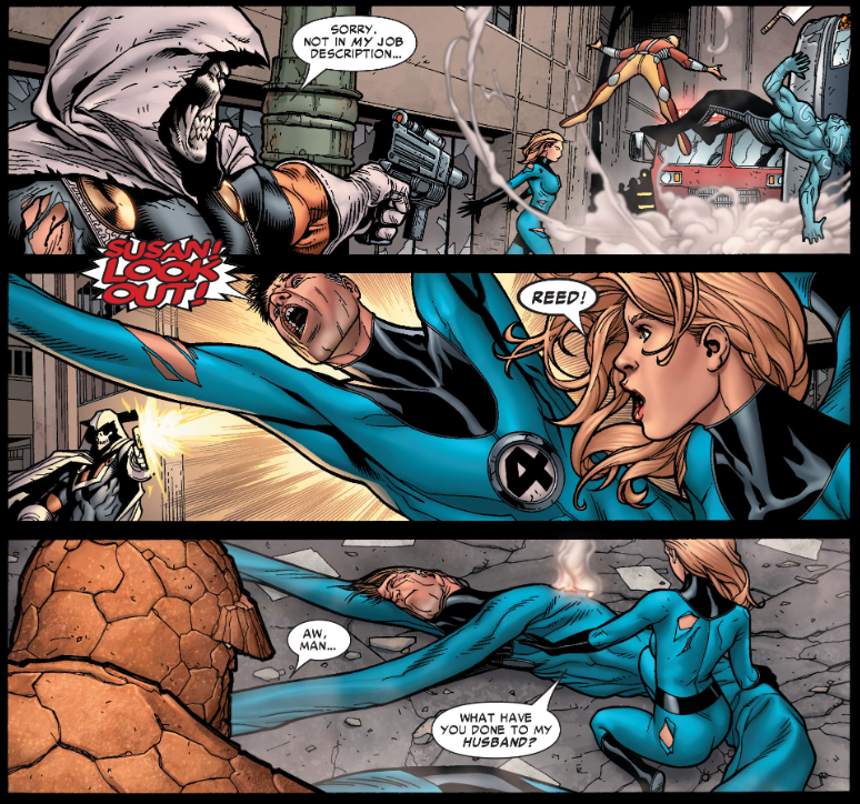 Then Taskmaster, who’s with the new Thunderbolts, aims a gun at Sue. Reed jumps in at the last second and takes the shot, saving Sue’s life. Sue exclaims, “What have you done to my husband?” and she crushes Taskmaster under a force field.