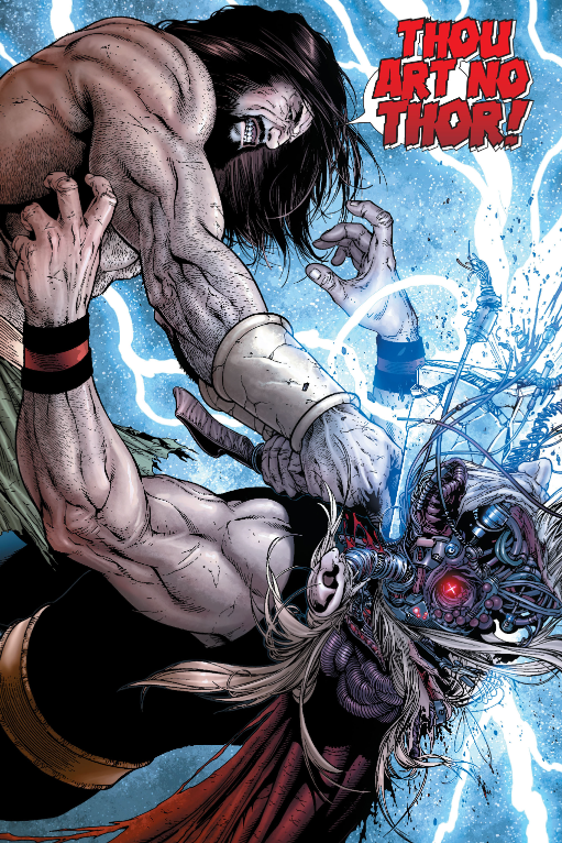 Nearby, Hercules lifts Thor’s hammer. (He can do that? Wait, is this the actual hammer or isn’t it?). Herc says, “Thor was a friend of mine,” followed by “Thou art no Thor!” Then he uses the hammer to smash in the clone’s head in a moment of truly eye-popping violence.