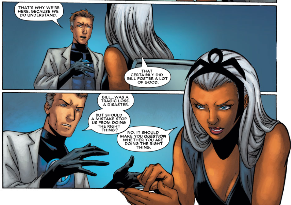 Fade out: Sue is featured prominently in the Black Panther issue, establishing a friendship between her and Storm. This and Storm’s talk with Reed help set up things to come.