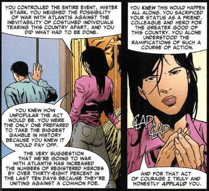 Reporters Ben Urich and Sally Floyd manage to get interviews with Cap and Iron Man. Cap acts apologetic about his actions, while Sally rips on him for his ideals being outdated. Then they get an audience with Tony Stark. They question him about an incident earlier in Front Line, when the Green Goblin attacked some Atlanteans. They say that Tony controlled nanites in Norman Osbourne’s body to make him attack, in hopes that a war against Atlantis could unite the heroes, rather than drive then apart in the Civil War. Sally says that the registration act, the Initiative, and the Negative Zone prison were all engineered by Stark against the inevitability of a war with Atlantis. Tony throws them out of his office and then chucks his Iron Man helmet across the room in remorse over his actions.
