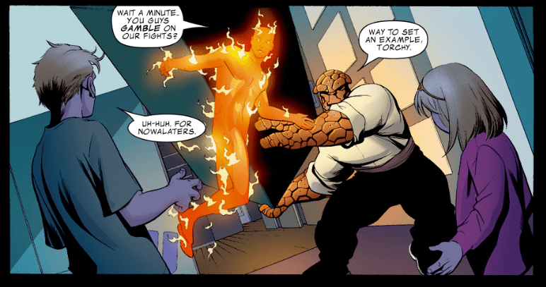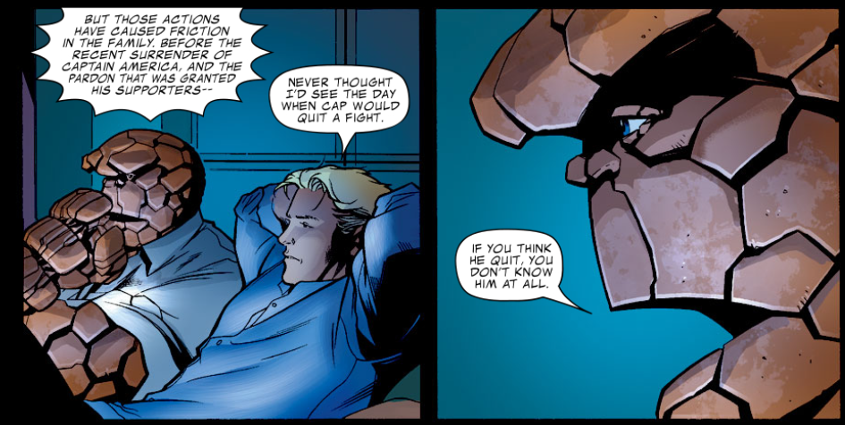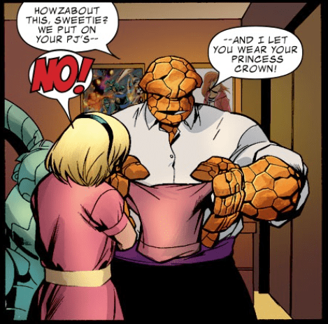 Then the whole Civil War thing rears its ugly head again. Wolverine is interviewed, saying Reed is a good man, who just screwed up big-time. Tony Stark argues that Reed’s actions during the Civil War were he’s always done, looking to the future and finding a solution. Ben puts the kids to bed for this part, and then he and Johnny debate whether Captain America’s surrender is genuine. Ben says he will still follow Reed into battle, but only if he believes Reed is right. Johnny says he will, if he has the chance.