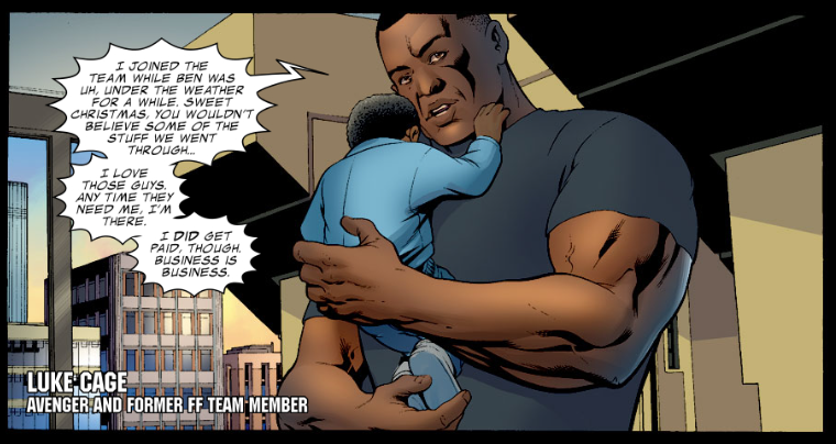 Back to more Lateline interviews. Mailman Willie Lumpkin says that despite all their cosmic adventures, the FF never railed to say good morning to him. Wyatt Wingfoot says the FF always treated him like extended family. Spider-Man, whose secret identity is still public, talks about trying to join the FF in his early days. Luke Cage talks about his time as a member of the team, saying that he’ll be there again if they ever need him – as long as he gets paid.