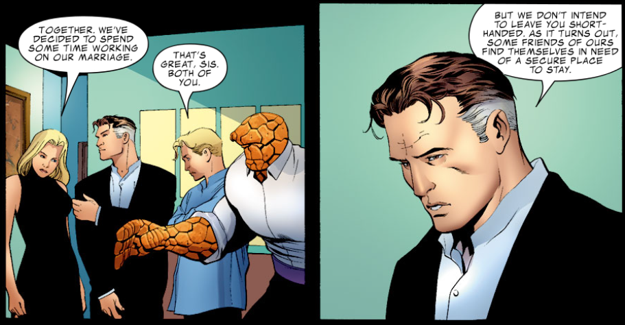 The Lateline show concludes with the host saying that the FF’s legend is secure, but their future is uncertain. Then Reed and Sue return, saying they’ve talked things out and made a good start. Johnny and Ben extend their hands to them to do their classic four-hands-at-once move, but Sue and Reed don’t join them. She says they’re not leaving the team, but taking a break to work on their marriage. Reed says they have two friends currently looking for a new home, and will fill in for them while they’re away.