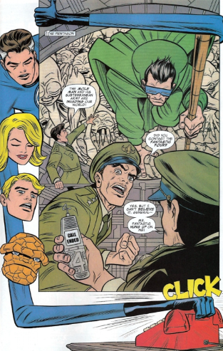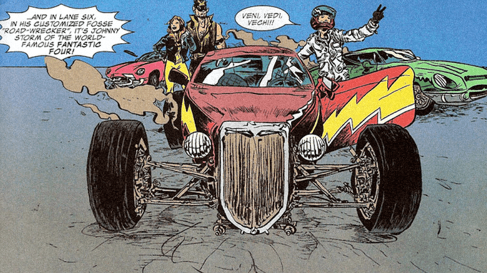 The second backup story, written and drawn by Paul Pope, has Johnny, Ben, Spider-Man and Crystal pulling pranks on each other at a car show, only for it to get out of hand. A car explodes, and Spidey and Johnny put out the fire while bickering the whole time.