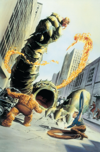 Trivia time: One of the videographer’s “photographs” on her wall is really a reproduction of Alex Ross’s painting of the cover of Fantastic Four #1. But is that canon? In the first issue, the giant monster action took place on the Mole Man’s island.