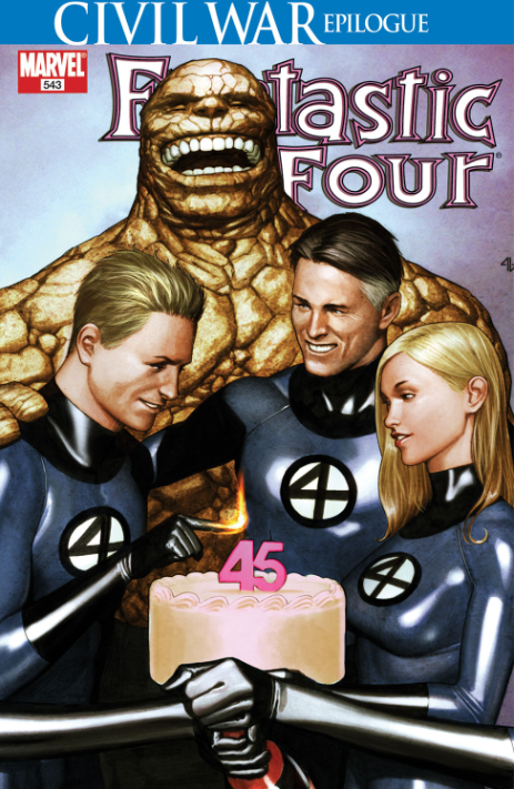 Reading the Fantastic Four comics from the start. Issue #543 is the FF’s 45th anniversary, so Marvel wanted to do a special issue. But it’s also a Civil War tie-in, so we have to deal with that as well. The solution? Announce another big change.