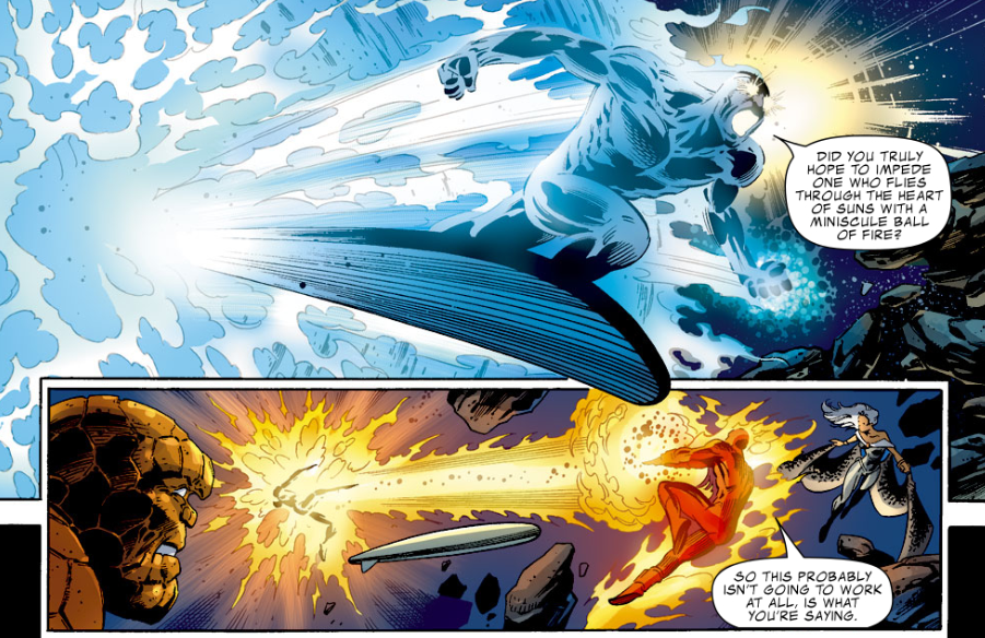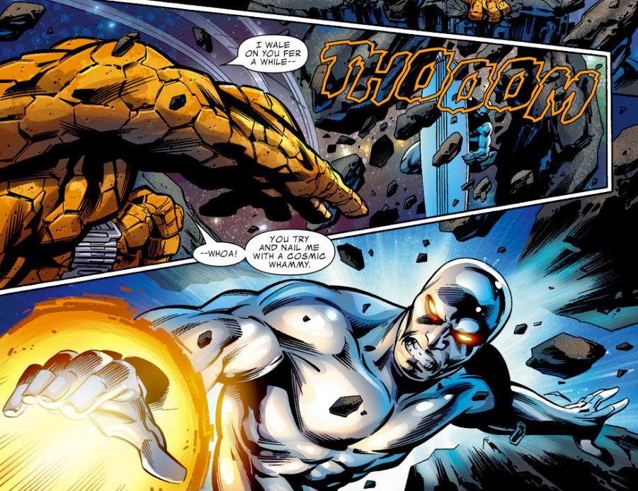 Clobberin’ time: Ben and Silver Surfer greet each other as friends, but they’re not above fighting each other if they must. This makes sense considering the characters’ shared history.