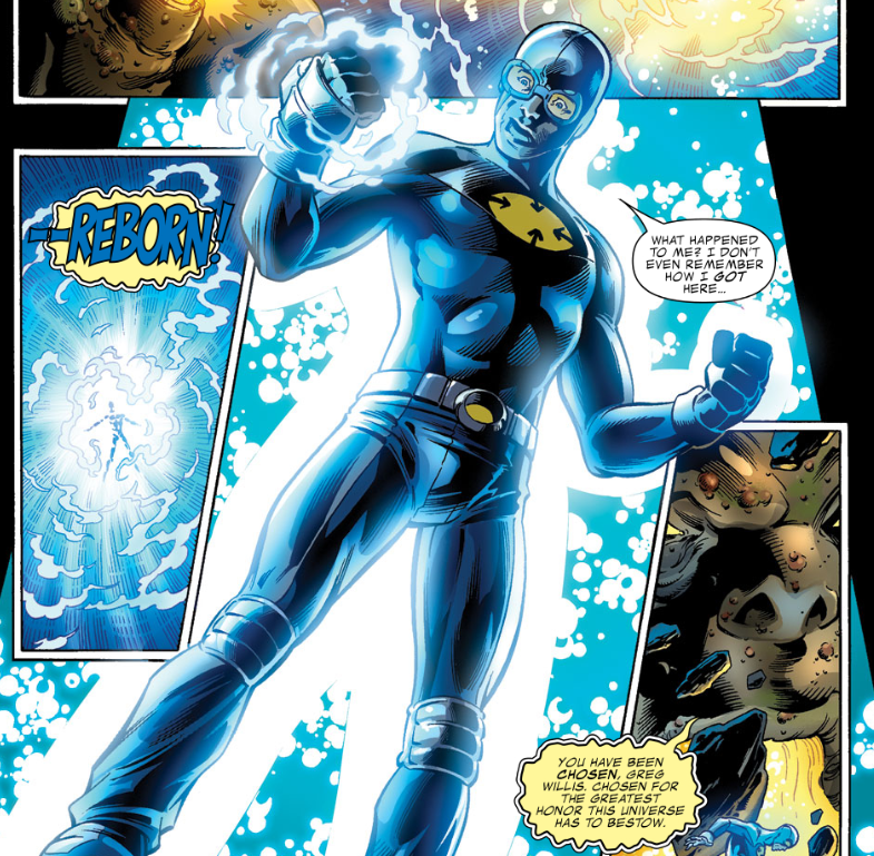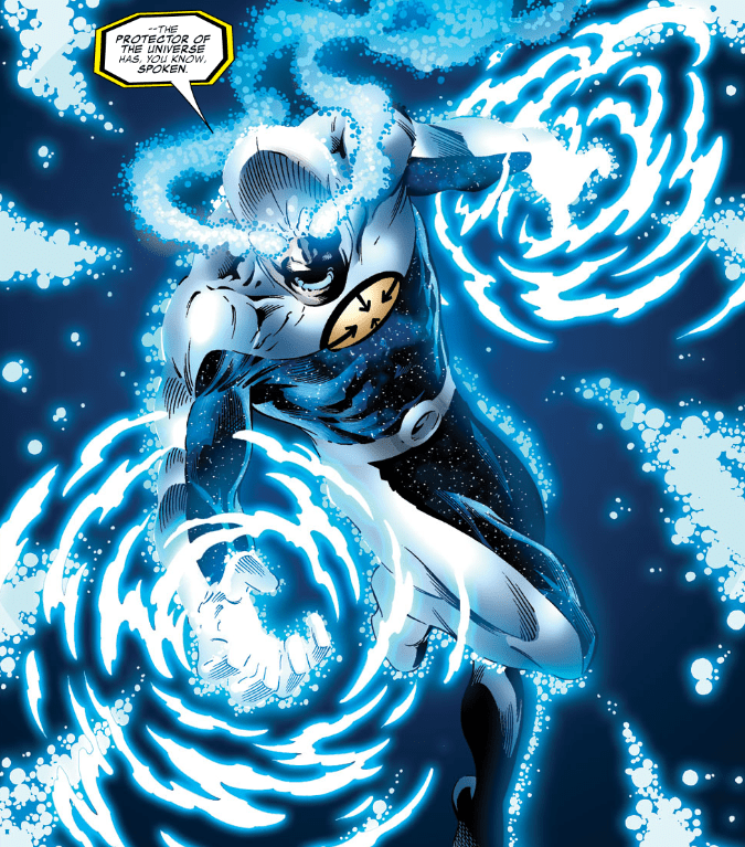 Epoch explains that when Gravity made his heroic life-ending sacrifice (this happened in the miniseries Beyond), his essence merged with the forces that gave him his gravity-manipulating superpowers. Gravity demands to be returned to Earth, but Epoch refuses. She says that Quasar is no more, so the universe needs a new protector, and Gravity gets the job.