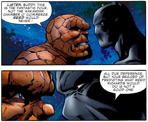 Fantastic fifth wheel: This issue shows the differences in leadership between Black Panther and Reed. Both are science geniuses, but Reed is more of an improvisor, while Black Panther is more of a strategist who has planned ahead for any given possibility.