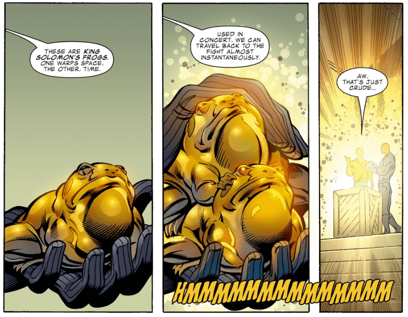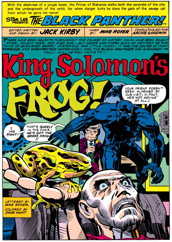 Trivia time: This business about King Solomon’s frogs might seem random, but the frogs were a key part of the first issue of Black Panther’s first-ever solo series, 1977’s Black Panther #1. That issue states they are brass frog sculptures, but they appear to move at times, so who knows?