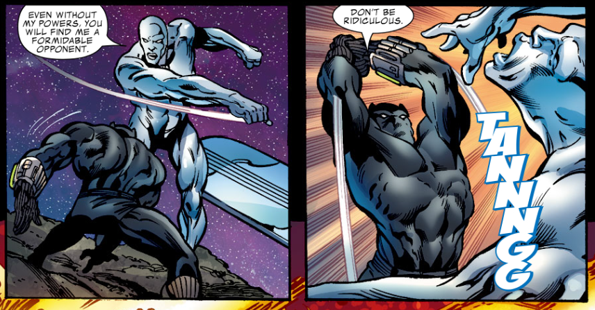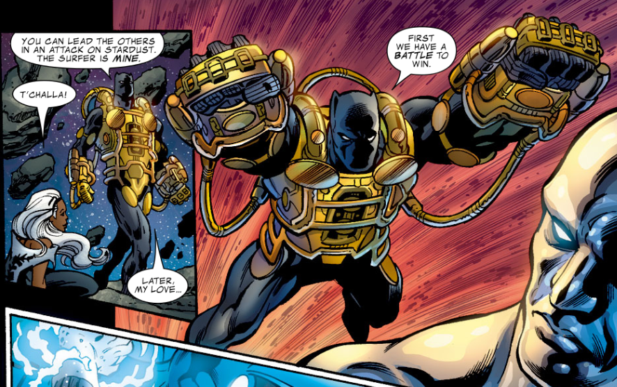 Fantastic fifth wheel: We’re told the power-siphoning armor is only one part of Black Panther’s anti-Galactus plan. The rest involves the Wakandan Air Force, a shape-changer, and the Hulk. He skips those because he’s in a hurry.