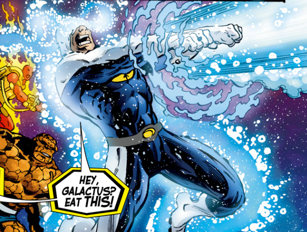 Johnny and Gravity defeat Stardust, and then Gravity flies up to Galactus, who is still assembling his planet-devouring machine. Gravity manages to hurt Galactus with a cosmic blast. But it’s Storm who does the talking, demanding that Galactus let Epoch go. Rather than fight Galactus, Gravity unleashes his power onto Galactus, to feed his hunger rather than injure him.