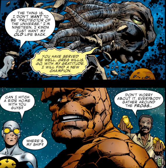 Galactus says he is restored to full strength, so he offers Gravity a boon. He asks that Galactus not harm Epoch, and Galactus swears to do so. He vanishes, and Epoch offers her thanks. She offers Gravity the chance to return to his chrysalis and regain his cosmic powers and his status as champion of the universe. He turns down her offer because he wants his old life back. Epoch agrees to this, and she says she will find another champion. Collins uses the frogs to return everyone to Earth. Gravity leaves for his parents’ home in Wisconsin to tell them he’s still alive. Ben says, “I’d call first.”