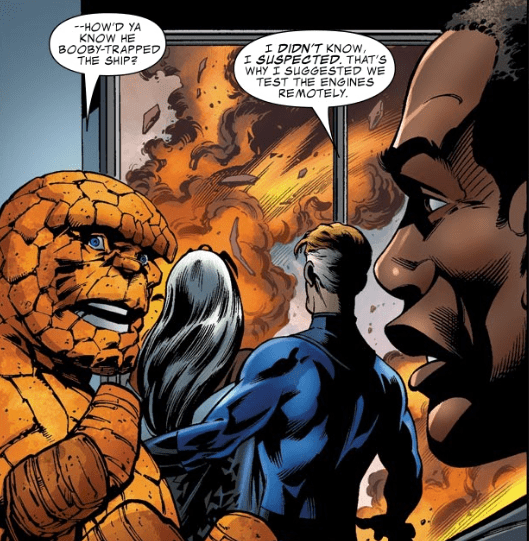 Recap: After the ever-tumultuous superhero Civil War, Reed and Sue left the team to reconcile their marriage, with Black Panther and Storm taking their place in the FF. Reed and Sue’s “second honeymoon” on Titan was interrupted by a message from aliens called Odopodians, whose society is (was?) under attack by rival aliens the Contrasepsis. Reed returned to Earth to work with the FF and Hank Pym on this. Back on Titan, Sue was attacked by the Frightful Four. Their leader the Wizard planted a bomb on Reed’s ship, blowing it up.