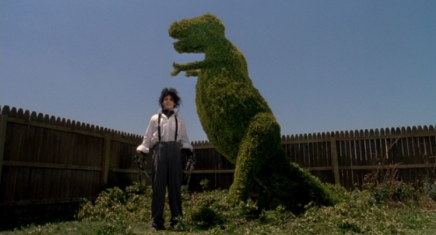 Outsider theory: I don’t know if any Burton character is more of an outsider than Edward. All the suburbanites are drawn to the artwork – topiaries, haircuts, etc. – but they also consider him dangerous, or at least worthy of an entire answering machine tape’s worth of gossip.