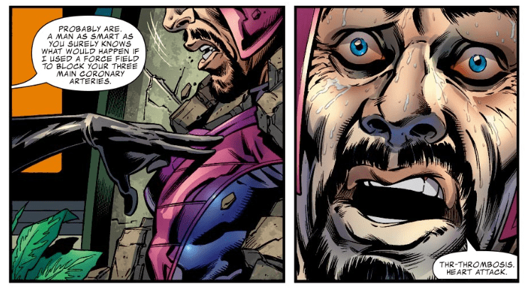 The Frightful Four regroup and are ready for round two, but then Storm reveals she’s rescued Sue, and removed the power-dampening device the Wizard put on her. Sue shows the villains what she’s made of by smashing Titania into the ceiling and tossing Hyrdo-Man out into space, where he freezes in absolute zero. She then destroys the Wizard’s anti-grav tech and tells him off, saying that he’s wasted his genius on trying to outsmart Reed, someone who would’ve never harmed him. Still not done, she turns his chest invisible so everyone can see his beating heart, and she threatens to use her force fields to give him a heart attack. He faints with fear, and Sue admits she was bluffing.