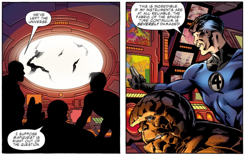 Reed surmises that something’s gone horribly wrong with the space-time continuum. Although they’re no longer in the universe, the ship is still able to contact Hank Pym (secretly a Skrull in disguise) on Earth. Hank says Tony Stark’s people analyzed the object containing the Oditopian message, revealing it to be a quantum destabilizing weapon, which can destroy spacetime. The FF fears they’ve already used it.