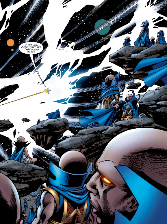 The heroes take the Frightful Four hostage, and take off on the FF’s new Fold Ship. Then Reed fills everyone in on the main plot, how he received a message from aliens called Oditopians, who may be hunted to extinction by a second alien species called Contrasepsis. The ship takes off to the Oditopians’ world, only to drop out of hyperspace unexpectedly. Reed says that when they left hyperspace, they didn’t reenter the universe. Instead, the ship is in an all-white void.