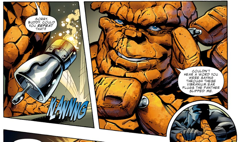 Klaw zaps Black Panther, thinking he has an advantage, only to discover that he’s one of the FF now. Klaw knocks the heroes back with a soundwave so he and the Wizard can chat. Wizard says that Klaw is dead, and this is a clone of Klaw recreated from a sound sample. Wizard also gave this new Klaw a way around the Vibranium weave in Black Panther’s armor. Then Ben punches out Klaw, revealing that Black Panther slipped him some Vibranium earplugs while they appeared weakened.