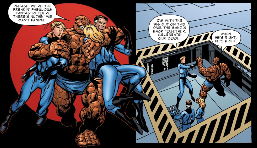 Clobberin’ time: Ben is in a celebratory mood with the team being back together and fighting villains again. This is likely why he’s so eager for a fight throughout the issue when everyone wants to talk.