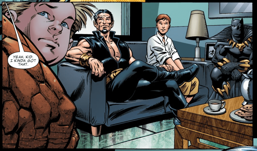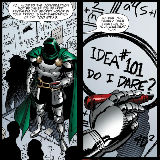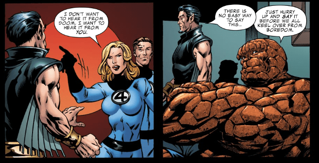 Doom chides Reed for telling his teammates about the 100 ideas. Then he says the ideas have led to massive global societal upheavals. Even if Reed predicted that, Doom says, that’s not the sole reason he didn’t tell his family. Instead, Doom says, there is a 101st plan that Reed currently has in the works. Doom says he, Namor, and T’Challa are there to prevent 101 from happening.