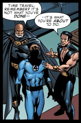 Then another twist, when Reed asks who they’re saving the world from, T’Challa says, “From you.” Doom adds that they are there not because of something Doom did, but because of something Reed is going to do. Reed then shows everyone his private thinking room, with all his equations written all over the walls, which was introduced during Civil War. Doom says Reed’s writings are well-known in the future, as these are the 100 ideas he dreamed up with Tony Stark to improve the world. Sue still feels stung, reminding everyone that Reed’s calculations predicted (or perhaps led to) all the ugliness of the superhero civil war.