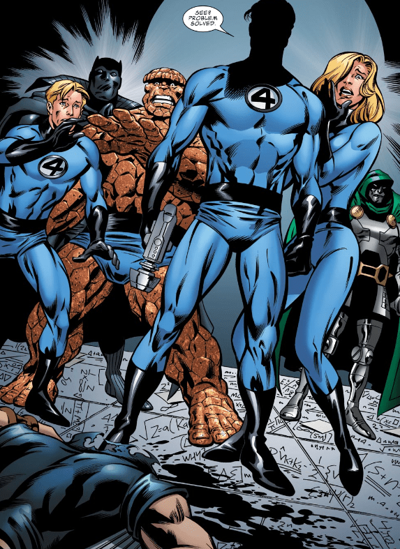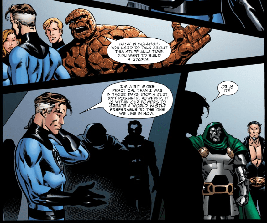 Doom says that in the future, Reed’s equation worked, and the Earth did indeed become a utopia, without crime or disease, and with all people living in abundance. But then the populace started worshipping Reed, the praise went to his head, and Sue left him for Namor.