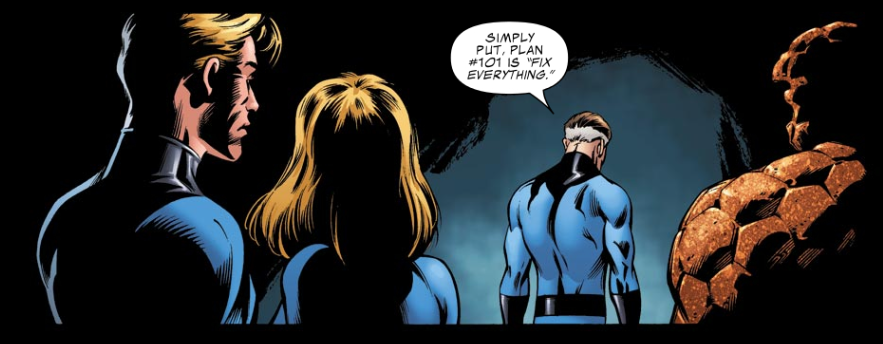 Ben is ready for a fight again, but Doom says they’re not there to kill Reed. T’Challa says their mission is convince Reed to make the right decision. Ben presses Reed on what plan 101 is, and he says that it’s “fix everything.” It’s a single equation that could result in a worldwide utopia. Reed insists that it’s possible, but then he looks at his three visitors and asks, “Or is it?”
