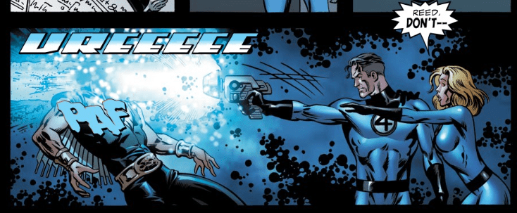 As the others react to this, Namor shares his side of the story. As Reed’s future good works increased, he became more and more distant, driving his family and friends out of his life. Namor is apologetic, but he insists that they’ve come to the present because the stakes are so high, and that something must be done. Reed agrees, saying he’s worked out the answer. He pulls out a high-tech gun (!) and he shoots Namor in the face (!!). On the last page, a shadow falls over Reed’s face as he stands over Namor’s bloody corpse, saying “See? Problem solved.”