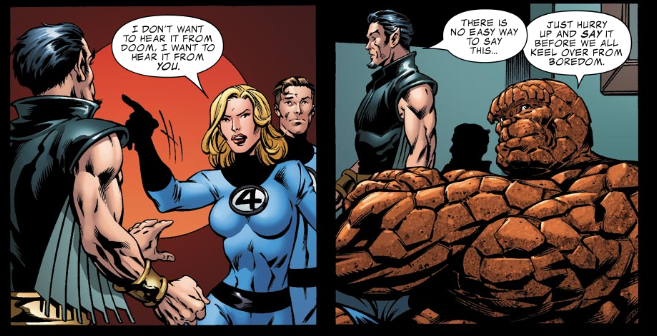 Ben tries attacking Doom, but Doom has a new type of force field that Reed says is only theorized. Then Reed deduces that this is his own theory come to life. Before more fighting breaks out, T’Challa says he and Namor convinced Doom to come into the past with them. Sue doesn’t trust Namor, but Reed is willing to hear him out (!) because Doom was once honest with him on the Latverian Day of Reproachment. Namor does the talking, saying the three of them stole a time machine and came to the present on a mission to save the world.