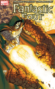 The entire FF fights Dr. Doom, and he had defenses for each of them. After fighting off Sue, Ben, and Johnny, Doom holds up a small sphere, which turns into metal rods that entangle Reed as he tries to stretch. Rather than plead for mercy, Reed demands that Doom tell him what happens in the future, and how Reed’s idea #101 really harms humanity.