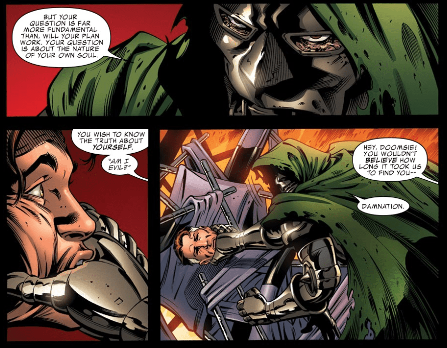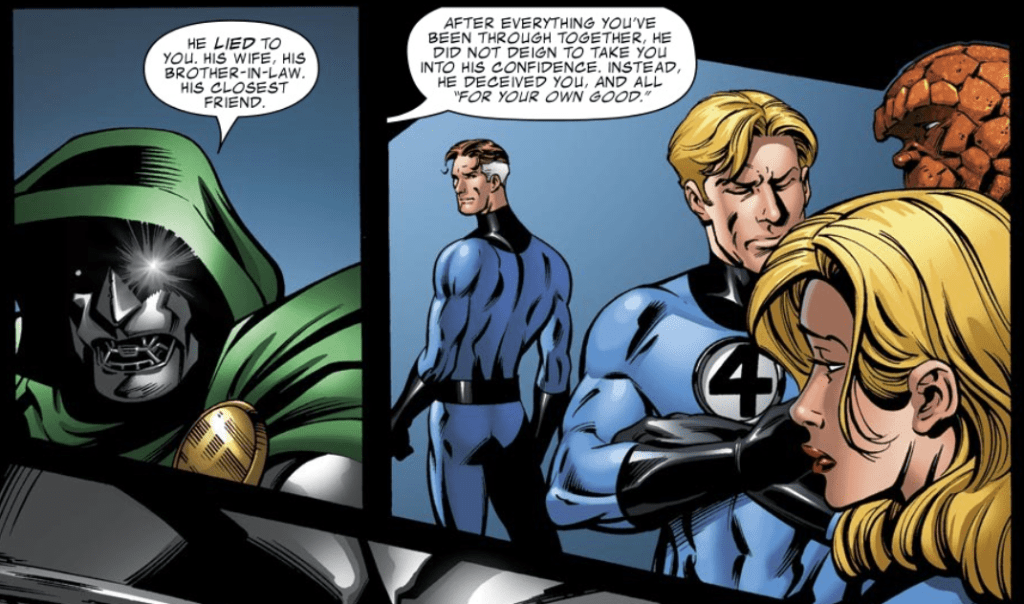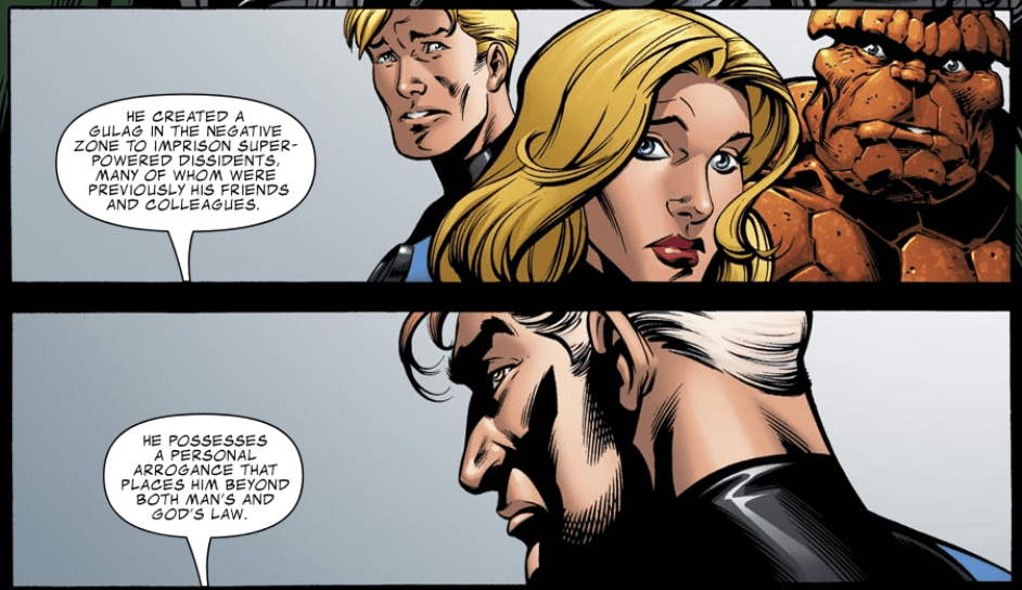 Sue demands that Doom leave, but Doom reminds her of Reed’s questionable and possibly treacherous actions during Civil War. Doom claims that Civil War’s Negative Zone prison violates human rights, and that Reed’s arrogance puts him above “both man’s and god’s law.” He then rubs salt on the wound by reminding everyone of Bill Foster’s death during Civil War.