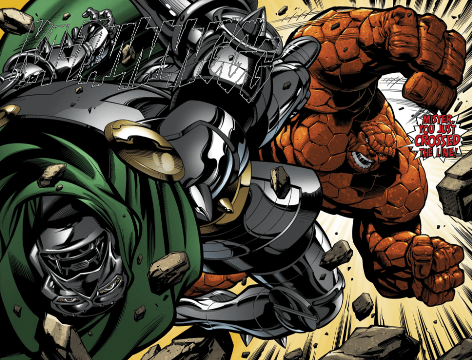 Doom continues, saying that Reed lied to his family under the auspices of it being “all for your own good.” He further confesses that he hates Reed not because Reed is his opposite, but because he now sees something of himself in Reed. Turn the page, and it’s a double-page spread of Ben punching Dr. Doom in the face, with Ben saying, “You just crossed the line!”
