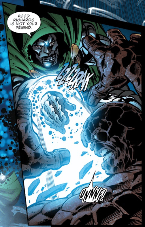 Ben punches Doom outside of the building and into the street outside, pummeling Doom into the street. Ben says he doesn’t care how it looks or what people say, Reed is a good man. Ben delivers a big speech about how Reed only cares about the truth, and about standing up for anyone who’s got a raw deal in life. Ben adds that Reed is especially loyal to his own family. Doom reveals he repaired his own armor during Ben’s speech. He fights back, electrocuting Ben while arguing that Reed is not Ben’s friend.