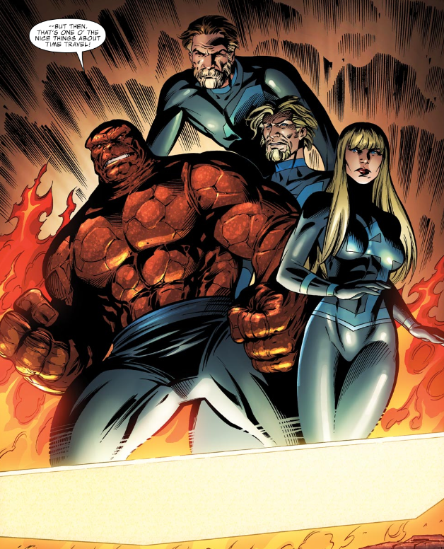 Doom grabs Reed by the mouth (!) and says that Reed’s real question is that of his own soul, that Reed questions whether he himself is evil. Then a voice says “Hey Doomsie!” Turn the page and we see an older Fantastic Four time-traveling onto the scene.