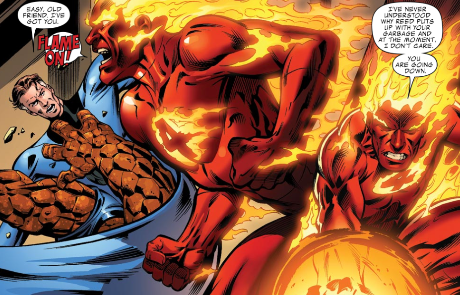 Flame on: Of the four, Johnny has had the least one-on-one interaction with Dr. Doom over the years, which makes his two-page fight with Doom in this issue especially interesting. Johnny says he never understood why Reed doesn’t just do away with Doom and get it over with.