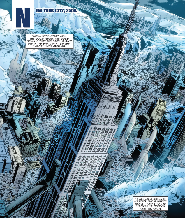 This issue begins with a flash forward, showing New York City being flooded. The caption narration says this is the eco-disaster that Reed’s old flame Alyssa Moy has been trying to prevent. Thanks to Reed’s efforts, the disaster did not happen in thirty years, but in five hundred. We see lots of images of death and destruction, leading to the year 2509, in which the Hulk and Earth’s remaining superheroes build the Great Machine. Hulk exclaims, “We’re going back in time.”