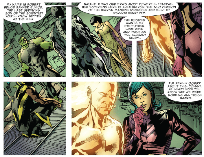 Cut the present, where Johnny is the one being told this story. He concludes that the heroes defeated Galactus and then used his powers to fuel the time machine. Hulk says he’s really Hulk Junior, son of the original. He introduces the others: Natalie X, Alex Ultron, the Hooded Man, Lightwave, and of course Psionics. Hulk Junior also says the Hooded Man is his stepfather, and Alex and Natalie are a couple.