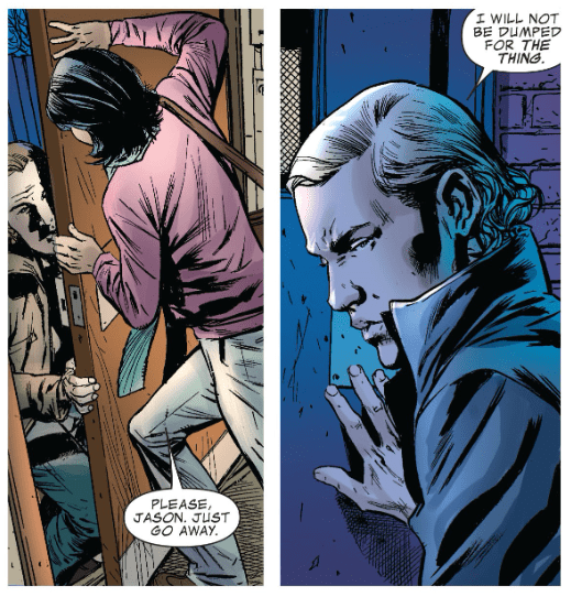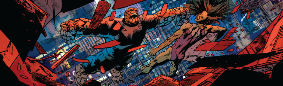 Out in the streets of NYC, Reed, Ben, and Sue examine the wreckage of last issue’s fight between Lightwave and Johnny. A cop says there are no civilian fatalities from the fight, but Sue and Reed and more concerned about Johnny’s disappearance. In Washington Heights, we follow Ben’s new girlfriend Debbie Green, as she meets with man named Jason. He acts threatening, and he tells him to leave her alone. He says people are laughing at her, and he adds, “I will not be dumped for the Thing.”