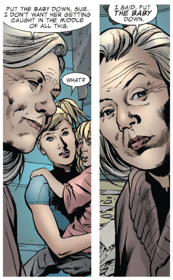 Ben and She-Hulk, who is there to work with Sue’s new charity fundraising group, meet up with Deneuve to get her to safety. But then another unseen power forces them through the floor and then outside the building. Then Sue and Valeria run up. Sue promises to get Deneuve and Valeria to safety, but all Deneuve says is, “Put the baby down.”