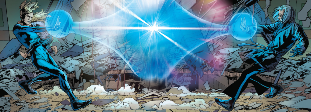 Turn the page and see Sue and Deneuve fighting each other with matching invisible force fields. Sue is stronger, but Deneuve is the more experienced fighter. She knocks Sue out. Deneuve tells Valeria that Sue will be fine. Valeria, whom you’ll remember was revealed to be a child genius a few issues back, asks about the rest of the world. Deneuve says, “The rest of the world should have been more careful about the future they left us.”